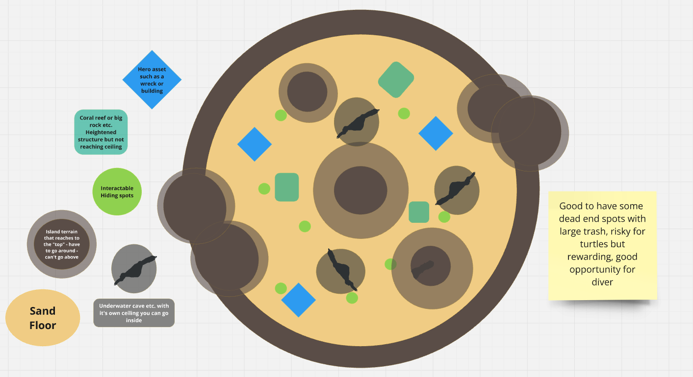 Because of the gameplay dynamic between turtles and the diver, the most memorable moments were ones where turtles had to make risk/reward judgements on whether to go get food and the diver doing successful ambushes. To generate more of those moments, the level was populated with tunnels that would reward turtles with food but serve as risky chokepoints that also the diver could use to stage surprise attacks.