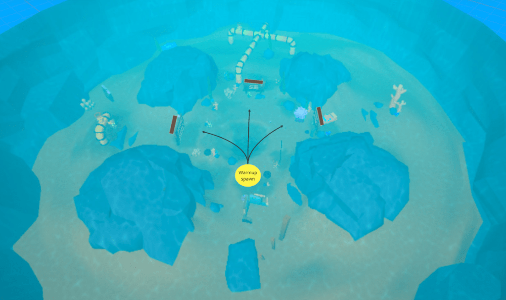 The environment of the game posed an interesting level design challenge since it took place underwater and swimming allows for near boundless vertical movement. A typical tag obstacle to run around could also now be swum (mostly) over.