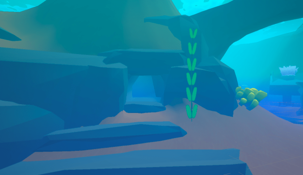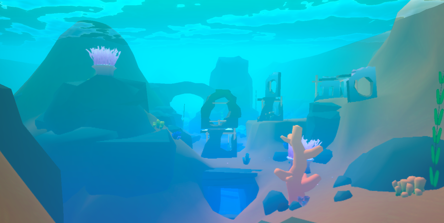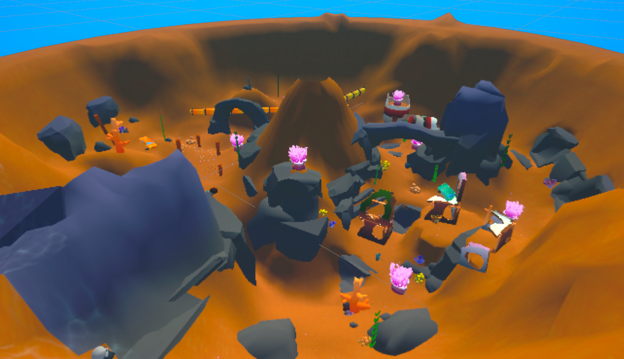 The original concept took place in the bottom of the ocean with no natural boundaries for the level. I quickly decided to place the level in a shallow lagoon to provide for natural boundary “walls” and a “ceiling” in the form of the beach line and the water surface. The shape of the level basically became a bowl. I used the ProBuilder package to construct the entire level geometry.